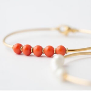 Bracciale rigido ovale in oro giallo 18kt. Il filo d’oro giallo, essenziale nella sua semplicità, accompagna le vivaci sfere di corallo. Braccialetto realizzato a mano, nel nostro laboratorio.
